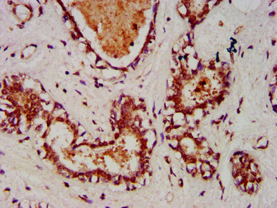 IHC image of CSB-PA836246LA01HU diluted at 1:1000 and staining in paraffin-embedded human breast cancer performed on a Leica BondTM system. After dewaxing and hydration, antigen retrieval was mediated by high pressure in a citrate buffer (pH 6.0). Section was blocked with 10% normal goat serum 30min at RT. Then primary antibody (1% BSA) was incubated at 4°C overnight. The primary is detected by a biotinylated secondary antibody and visualized using an HRP conjugated SP system.
