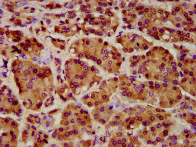 IHC image of CSB-PA836246LA01HU diluted at 1:1000 and staining in paraffin-embedded human pancreatic cancer performed on a Leica BondTM system. After dewaxing and hydration, antigen retrieval was mediated by high pressure in a citrate buffer (pH 6.0). Section was blocked with 10% normal goat serum 30min at RT. Then primary antibody (1% BSA) was incubated at 4°C overnight. The primary is detected by a biotinylated secondary antibody and visualized using an HRP conjugated SP system.