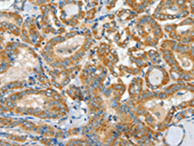The image on the left is immunohistochemistry of paraffin-embedded Human thyroid cancer tissue using CSB-PA305079(ASCC1 Antibody) at dilution 1/30, on the right is treated with fusion protein. (Original magnification: ×200)