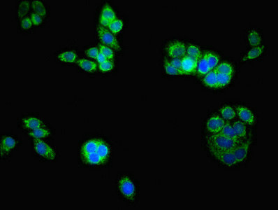 Immunofluorescent analysis of PC-3 cells using CSB-PA713133ESR1HU at dilution of 1:100 and Alexa Fluor 488-congugated AffiniPure Goat Anti-Rabbit IgG(H+L)