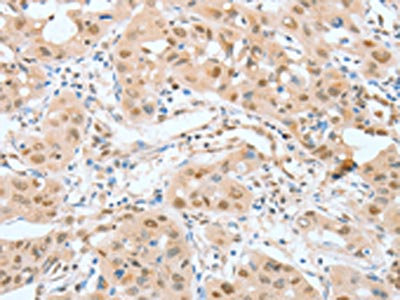 The image on the left is immunohistochemistry of paraffin-embedded Human lung cancer tissue using CSB-PA076734(ATF2 Antibody) at dilution 1/15, on the right is treated with fusion protein. (Original magnification: ×200)