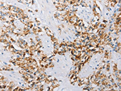 The image on the left is immunohistochemistry of paraffin-embedded Human prostate cancer tissue using CSB-PA195861(ATG4C Antibody) at dilution 1/25, on the right is treated with fusion protein. (Original magnification: ×200)