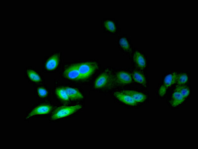Immunofluorescent analysis of Hela cells using CSB-PA002299LA01HU at dilution of 1:100 and Alexa Fluor 488-congugated AffiniPure Goat Anti-Rabbit IgG(H+L)