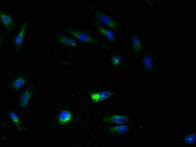 Immunofluorescent analysis of Hela cells using CSB-PA728503LA01HU at dilution of 1:100 and Alexa Fluor 488-congugated AffiniPure Goat Anti-Rabbit IgG(H+L)