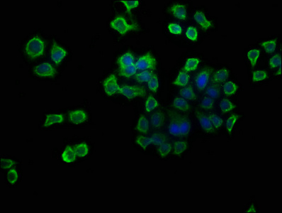 Immunofluorescence staining of PC-3 cells with CSB-PA00135A0Rb at 1:133, counter-stained with DAPI. The cells were fixed in 4% formaldehyde, permeabilized using 0.2% Triton X-100 and blocked in 10% normal Goat Serum. The cells were then incubated with the antibody overnight at 4°C. The secondary antibody was Alexa Fluor 488-congugated AffiniPure Goat Anti-Rabbit IgG(H+L).