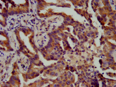 IHC image of CSB-PA002424LA01HU diluted at 1:400 and staining in paraffin-embedded human lung cancer performed on a Leica BondTM system. After dewaxing and hydration, antigen retrieval was mediated by high pressure in a citrate buffer (pH 6.0). Section was blocked with 10% normal goat serum 30min at RT. Then primary antibody (1% BSA) was incubated at 4°C overnight. The primary is detected by a biotinylated secondary antibody and visualized using an HRP conjugated SP system.