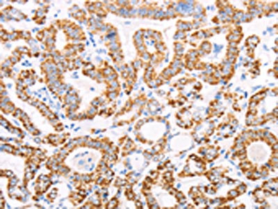 The image on the left is immunohistochemistry of paraffin-embedded Human thyroid cancer tissue using CSB-PA569426(ATPIF1 Antibody) at dilution 1/50, on the right is treated with fusion protein. (Original magnification: ×200)
