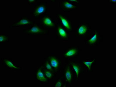 Immunofluorescence staining of A549 cells with CSB-PA002445LA01HU at 1:133, counter-stained with DAPI. The cells were fixed in 4% formaldehyde, permeabilized using 0.2% Triton X-100 and blocked in 10% normal Goat Serum. The cells were then incubated with the antibody overnight at 4°C. The secondary antibody was Alexa Fluor 488-congugated AffiniPure Goat Anti-Rabbit IgG(H+L).
