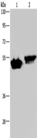 Gel: 8%SDS-PAGE, Lysate: 40 μg, Lane 1-2: Raji cells, Hela cells, Primary antibody: CSB-PA335882(AVEN Antibody) at dilution 1/200, Secondary antibody: Goat anti rabbit IgG at 1/8000 dilution, Exposure time: 2 minutes