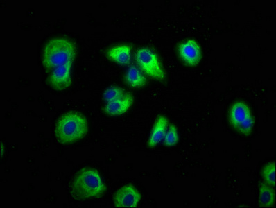 Immunofluorescence staining of HepG2 cells with CSB-PA897472LA01HU at 1:166, counter-stained with DAPI. The cells were fixed in 4% formaldehyde, permeabilized using 0.2% Triton X-100 and blocked in 10% normal Goat Serum. The cells were then incubated with the antibody overnight at 4°C. The secondary antibody was Alexa Fluor 488-congugated AffiniPure Goat Anti-Rabbit IgG(H+L).