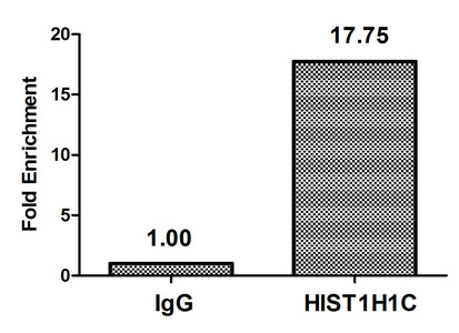 Chromatin Immunoprecipitation Hela (4*106, treated with 30mM sodium butyrate for 4h) were treated with Micrococcal Nuclease, sonicated, and immunoprecipitated with 5µg anti-HIST1H1C (CSB-PA010378PA62acHU) or a control normal rabbit IgG. The resulting ChIP DNA was quantified using real-time PCR with primers against the β-Globin promoter.