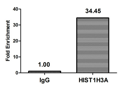Chromatin Immunoprecipitation Hela (4*106, treated with 30mM sodium butyrate for 4h) were treated with Micrococcal Nuclease, sonicated, and immunoprecipitated with 5µg anti-HIST1H3A (CSB-PA010418OA37acHU) or a control normal rabbit IgG. The resulting ChIP DNA was quantified using real-time PCR with primers against the β-Globin promoter.
