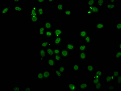 Immunofluorescence staining of Hela cells (treated with 30mM sodium butyrate for 4h) with CSB-PA010429OA91acHU at 1:5, counter-stained with DAPI. The cells were fixed in 4% formaldehyde, permeabilized using 0.2% Triton X-100 and blocked in 10% normal Goat Serum. The cells were then incubated with the antibody overnight at 4°C. The secondary antibody was Alexa Fluor 488-congugated AffiniPure Goat Anti-Rabbit IgG(H+L).