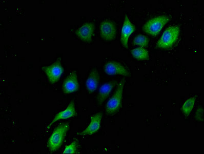 Immunofluorescence staining of A549 cells with CSB-PA002491LA01HU at 1:133, counter-stained with DAPI. The cells were fixed in 4% formaldehyde, permeabilized using 0.2% Triton X-100 and blocked in 10% normal Goat Serum. The cells were then incubated with the antibody overnight at 4°C. The secondary antibody was Alexa Fluor 488-congugated AffiniPure Goat Anti-Rabbit IgG(H+L).
