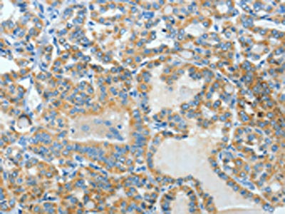 The image on the left is immunohistochemistry of paraffin-embedded Human thyroid cancer tissue using CSB-PA194965(BAAT Antibody) at dilution 1/30, on the right is treated with fusion protein. (Original magnification: ×200)