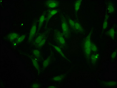Immunofluorescence staining of Hela cells with CSB-PA883427LA01HU at 1:266, counter-stained with DAPI. The cells were fixed in 4% formaldehyde, permeabilized using 0.2% Triton X-100 and blocked in 10% normal Goat Serum. The cells were then incubated with the antibody overnight at 4°C. The secondary antibody was Alexa Fluor 488-congugated AffiniPure Goat Anti-Rabbit IgG(H+L).