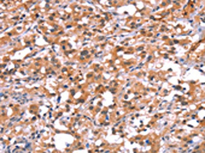 The image on the left is immunohistochemistry of paraffin-embedded Human gastric cancer tissue using CSB-PA941444(BCAR1 Antibody) at dilution 1/15, on the right is treated with synthetic peptide. (Original magnification: ×200)