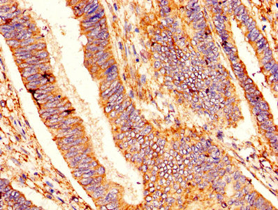 IHC image of CSB-PA002613HA01HU diluted at 1:400 and staining in paraffin-embedded human colon cancer performed on a Leica BondTM system. After dewaxing and hydration, antigen retrieval was mediated by high pressure in a citrate buffer (pH 6.0). Section was blocked with 10% normal goat serum 30min at RT. Then primary antibody (1% BSA) was incubated at 4°C overnight. The primary is detected by a biotinylated secondary antibody and visualized using an HRP conjugated SP system.
