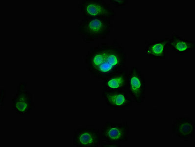 Immunofluorescence staining of A549 cells with CSB-PA872503LA01HU at 1:133, counter-stained with DAPI. The cells were fixed in 4% formaldehyde, permeabilized using 0.2% Triton X-100 and blocked in 10% normal Goat Serum. The cells were then incubated with the antibody overnight at 4°C. The secondary antibody was Alexa Fluor 488-congugated AffiniPure Goat Anti-Rabbit IgG(H+L).
