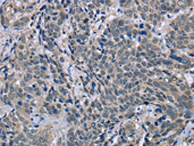 The image on the left is immunohistochemistry of paraffin-embedded Human cervical cancer tissue using CSB-PA979712(BMX Antibody) at dilution 1/30, on the right is treated with fusion protein. (Original magnification: ×200)