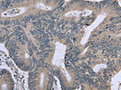 The image on the left is immunohistochemistry of paraffin-embedded Human colon cancer tissue using CSB-PA979712(BMX Antibody) at dilution 1/30, on the right is treated with fusion protein. (Original magnification: ×200)