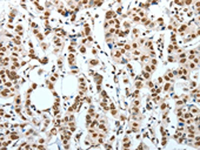 The image on the left is immunohistochemistry of paraffin-embedded Human breast cancer tissue using CSB-PA956646(BNIP1 Antibody) at dilution 1/60, on the right is treated with fusion protein. (Original magnification: ×200)
