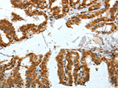The image on the left is immunohistochemistry of paraffin-embedded Human thyroid cancer tissue using CSB-PA200381(BNIP1 Antibody) at dilution 1/30, on the right is treated with fusion protein. (Original magnification: ×200)