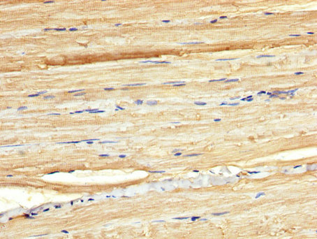 IHC image of CSB-PA750873LA01HU diluted at 1:300 and staining in paraffin-embedded human skeletal muscle tissue performed on a Leica BondTM system. After dewaxing and hydration, antigen retrieval was mediated by high pressure in a citrate buffer (pH 6.0). Section was blocked with 10% normal goat serum 30min at RT. Then primary antibody (1% BSA) was incubated at 4°C overnight. The primary is detected by a biotinylated secondary antibody and visualized using an HRP conjugated SP system.