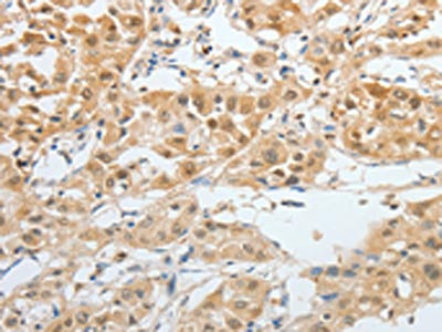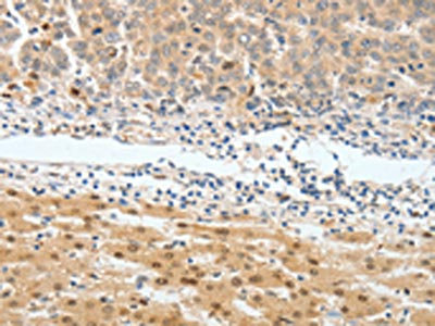The image on the left is immunohistochemistry of paraffin-embedded Human liver cancer tissue using CSB-PA086320(BPIFB2 Antibody) at dilution 1/45, on the right is treated with synthetic peptide. (Original magnification: ×200)