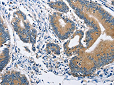 The image on the left is immunohistochemistry of paraffin-embedded Human colon cancer tissue using CSB-PA298431(BRE Antibody) at dilution 1/30, on the right is treated with fusion protein. (Original magnification: ×200)