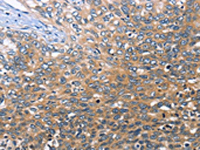 The image on the left is immunohistochemistry of paraffin-embedded Human cervical cancer tissue using CSB-PA298431(BRE Antibody) at dilution 1/30, on the right is treated with fusion protein. (Original magnification: ×200)