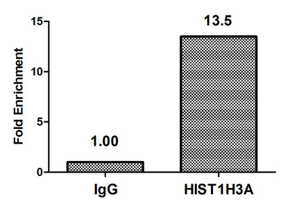Chromatin Immunoprecipitation Hela (4*106, treated with 30mM sodium butyrate for 4h) were treated with Micrococcal Nuclease, sonicated, and immunoprecipitated with 5µg anti-HIST1H3A (CSB-PA010418OA122butHU) or a control normal rabbit IgG. The resulting ChIP DNA was quantified using real-time PCR with primers against the β-Globin promoter.
