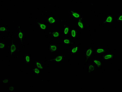 Immunofluorescence staining of Hela cells (treated with 30mM sodium butyrate for 4h) with CSB-PA010418OA23butHU at 1:10, counter-stained with DAPI. The cells were fixed in 4% formaldehyde, permeabilized using 0.2% Triton X-100 and blocked in 10% normal Goat Serum. The cells were then incubated with the antibody overnight at 4°C. The secondary antibody was Alexa Fluor 488-congugated AffiniPure Goat Anti-Rabbit IgG(H+L).