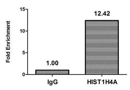Chromatin Immunoprecipitation Hela (4*106, treated with 30mM sodium butyrate for 4h) were treated with Micrococcal Nuclease, sonicated, and immunoprecipitated with 5µg anti-HIST1H4A (CSB-PA010429OA16butHU) or a control normal rabbit IgG. The resulting ChIP DNA was quantified using real-time PCR with primers against the β-Globin promoter.