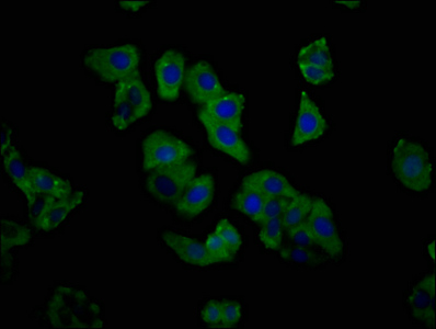 Immunofluorescence staining of HepG2 cells with CSB-PA882094LA01HU at 1:333, counter-stained with DAPI. The cells were fixed in 4% formaldehyde, permeabilized using 0.2% Triton X-100 and blocked in 10% normal Goat Serum. The cells were then incubated with the antibody overnight at 4°C. The secondary antibody was Alexa Fluor 488-congugated AffiniPure Goat Anti-Rabbit IgG(H+L).