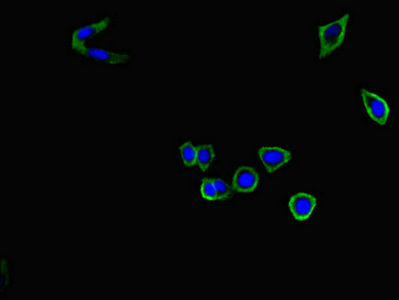 Immunofluorescent analysis of HepG2 cells using CSB-PA004259LA01HU at dilution of 1:100 and Alexa Fluor 488-congugated AffiniPure Goat Anti-Rabbit IgG(H+L)