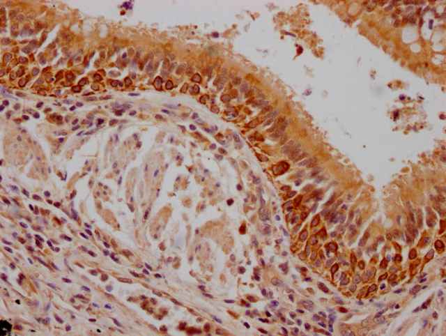 IHC image of CSB-PA614990LA01HU diluted at 1:200 and staining in paraffin-embedded human lung cancer performed on a Leica BondTM system. After dewaxing and hydration, antigen retrieval was mediated by high pressure in a citrate buffer (pH 6.0). Section was blocked with 10% normal goat serum 30min at RT. Then primary antibody (1% BSA) was incubated at 4°C overnight. The primary is detected by a Goat anti-rabbit polymer IgG labeled by HRP and visualized using 0.05% DAB.