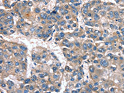 The image on the left is immunohistochemistry of paraffin-embedded Human liver cancer tissue using CSB-PA796294(CACNA1G Antibody) at dilution 1/20, on the right is treated with synthetic peptide. (Original magnification: ×200)