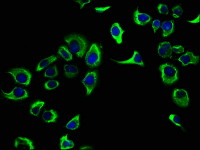 Immunofluorescence staining of A549 cells with CSB-PA004404EA01HU at 1:133, counter-stained with DAPI. The cells were fixed in 4% formaldehyde, permeabilized using 0.2% Triton X-100 and blocked in 10% normal Goat Serum. The cells were then incubated with the antibody overnight at 4°C. The secondary antibody was Alexa Fluor 488-congugated AffiniPure Goat Anti-Rabbit IgG(H+L).