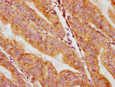 IHC image of CSB-PA004404EA01HU diluted at 1:400 and staining in paraffin-embedded human endometrial cancer performed on a Leica BondTM system. After dewaxing and hydration, antigen retrieval was mediated by high pressure in a citrate buffer (pH 6.0). Section was blocked with 10% normal goat serum 30min at RT. Then primary antibody (1% BSA) was incubated at 4°C overnight. The primary is detected by a biotinylated secondary antibody and visualized using an HRP conjugated SP system.
