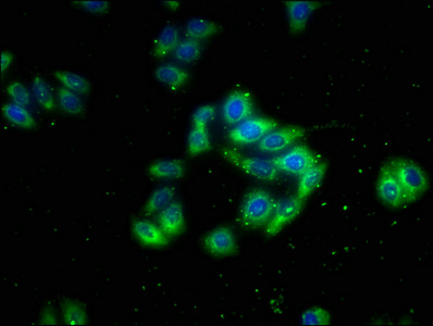 Immunofluorescence staining of HepG2 cells with CSB-PA801802LA01HU at 1:133, counter-stained with DAPI. The cells were fixed in 4% formaldehyde, permeabilized using 0.2% Triton X-100 and blocked in 10% normal Goat Serum. The cells were then incubated with the antibody overnight at 4°C. The secondary antibody was Alexa Fluor 488-congugated AffiniPure Goat Anti-Rabbit IgG(H+L).