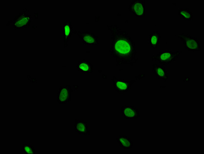 Immunofluorescence staining of U251 cells with CSB-PA872536LA01HU at 1:133, counter-stained with DAPI. The cells were fixed in 4% formaldehyde, permeabilized using 0.2% Triton X-100 and blocked in 10% normal Goat Serum. The cells were then incubated with the antibody overnight at 4°C. The secondary antibody was Alexa Fluor 488-congugated AffiniPure Goat Anti-Rabbit IgG(H+L).