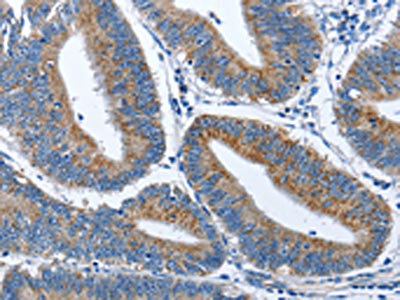 The image on the left is immunohistochemistry of paraffin-embedded Human colon cancer tissue using CSB-PA195475(CADM3 Antibody) at dilution 1/40, on the right is treated with fusion protein. (Original magnification: ×200)