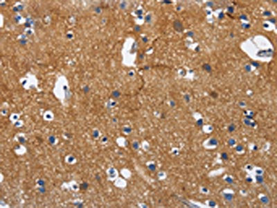 The image on the left is immunohistochemistry of paraffin-embedded Human brain tissue using CSB-PA195475(CADM3 Antibody) at dilution 1/40, on the right is treated with fusion protein. (Original magnification: ×200)