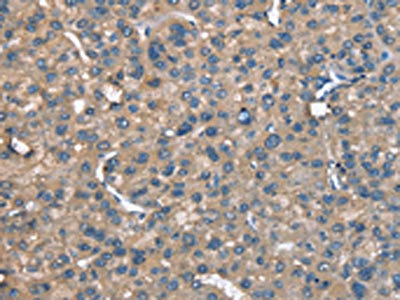 The image on the left is immunohistochemistry of paraffin-embedded Human liver cancer tissue using CSB-PA828264(CAGE1 Antibody) at dilution 1/20, on the right is treated with synthetic peptide. (Original magnification: ×200)
