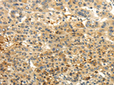 The image on the left is immunohistochemistry of paraffin-embedded Human liver cancer tissue using CSB-PA563243(CAMK1G Antibody) at dilution 1/30, on the right is treated with fusion protein. (Original magnification: ×200)