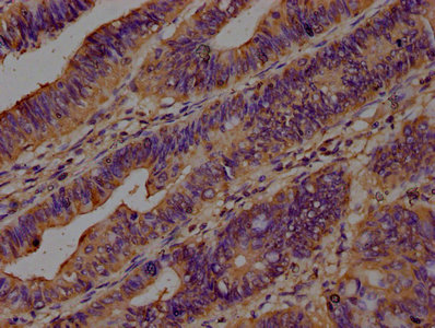 IHC image of CSB-PA004486LA01HU diluted at 1:200 and staining in paraffin-embedded human colon cancer performed on a Leica BondTM system. After dewaxing and hydration, antigen retrieval was mediated by high pressure in a citrate buffer (pH 6.0). Section was blocked with 10% normal goat serum 30min at RT. Then primary antibody (1% BSA) was incubated at 4°C overnight. The primary is detected by a biotinylated secondary antibody and visualized using an HRP conjugated SP system.