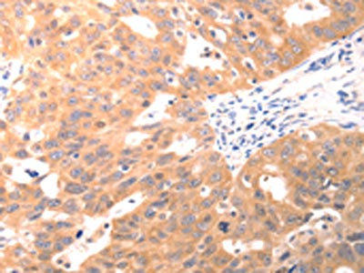 The image on the left is immunohistochemistry of paraffin-embedded Human ovarian cancer tissue using CSB-PA796509(CAPNS1 Antibody) at dilution 1/60, on the right is treated with fusion protein. (Original magnification: ×200)