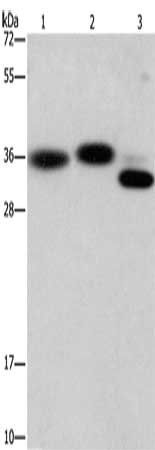 Gel: 15%SDS-PAGE, Lysate: 40 μg, Lane 1-3: Hela cells, mouse brain tissue, Mouse heart tissue, Primary antibody: CSB-PA102123(CAPZA2 Antibody) at dilution 1/650, Secondary antibody: Goat anti rabbit IgG at 1/8000 dilution, Exposure time: 1 minute