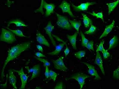 Immunofluorescence staining of U251 cells with CSB-PA863138LA01HU at 1:100, counter-stained with DAPI. The cells were fixed in 4% formaldehyde, permeabilized using 0.2% Triton X-100 and blocked in 10% normal Goat Serum. The cells were then incubated with the antibody overnight at 4°C. The secondary antibody was Alexa Fluor 488-congugated AffiniPure Goat Anti-Rabbit IgG(H+L).